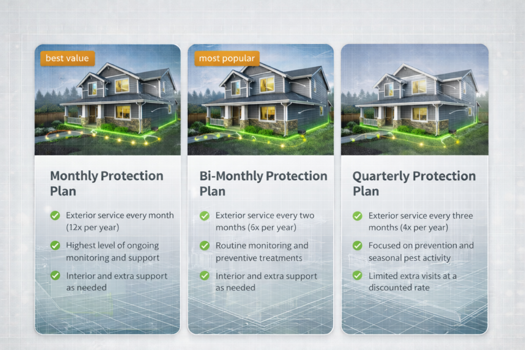 Our service plans are designed to provide reliable, ongoing pest management for homes and small commercial properties throughout Everett and North Seattle. Each plan focuses on prevention, monitoring, and targeted treatment—without overpromising or unnecessary services.