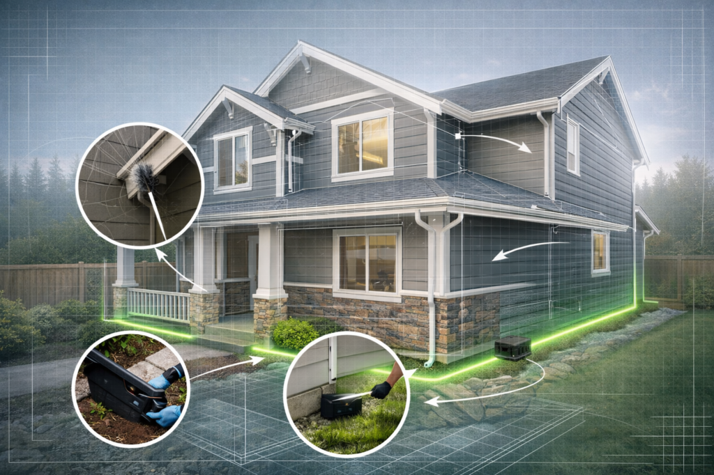 - Exterior treatments targeting the pests of concern, based on seasonal activity and inspection findings